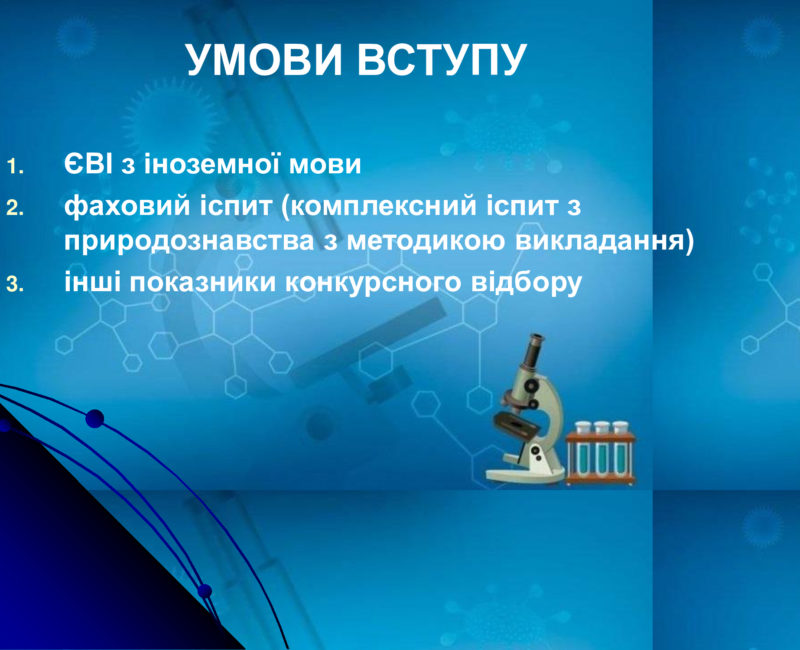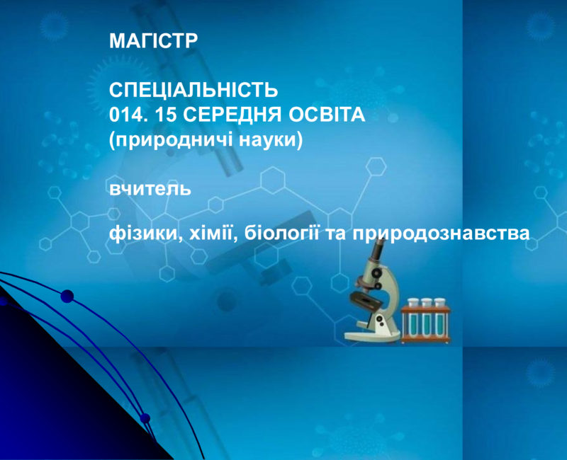 Термін навчання – 1 рік 4 місяці. Випускники даної спеціальності здобудуть кваліфікацію вчитель природничих наук, фізики, хімії, біології.