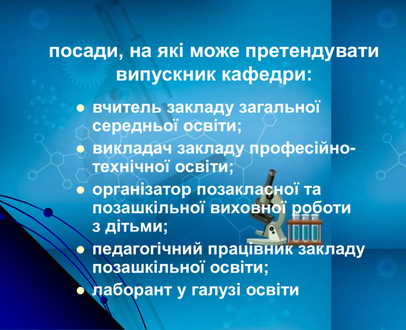 Також, Ви маєте можливість після закінчення магістратури отримати кваліфікацію – вчитель природничих наук, фізики, хімії і біології та в подальшому працювати – вчителем, викладачем або методистом.