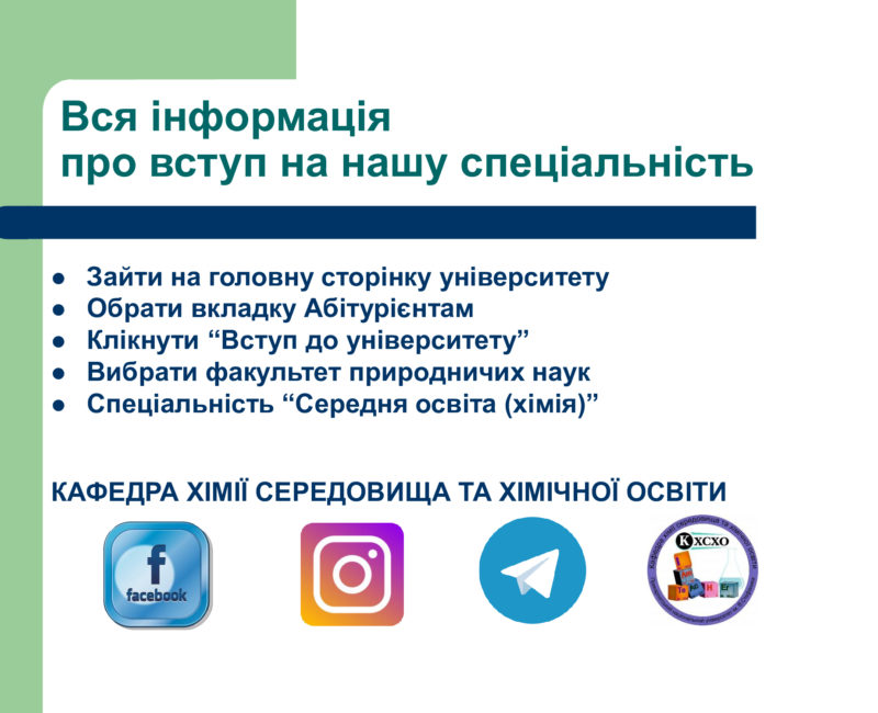 Також кафедра запрошує вступників на другий (третій) курс (з нормативним терміном навчання на вакантні місця) або на перший курс (зі скороченим терміном навчання)за умови вступу на споріднену спеціальність у межах вакантних місць ліцензованого обсягу з хімії для зарахування на навчання за ступенем бакалавра за спеціальністю.